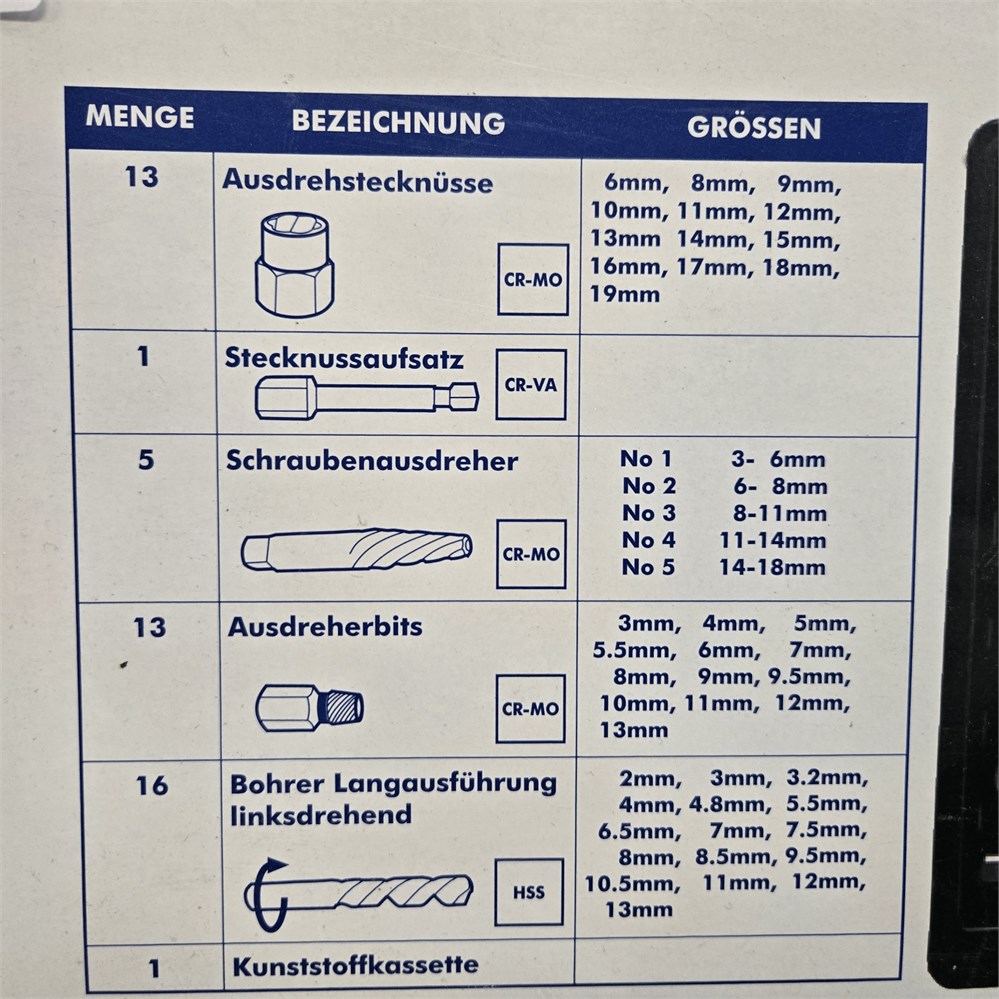 - 16 Bohrer Langausführung linksdrehend: 2mm, 3mm, 3.2mm, 4mm, 4.8mm, 5.5mm, 6.5mm, 7mm, 7.5mm, 8mm, 8.5mm, 9.5mm, 10.5mm, 11mm, 12mm, 13mm HSS