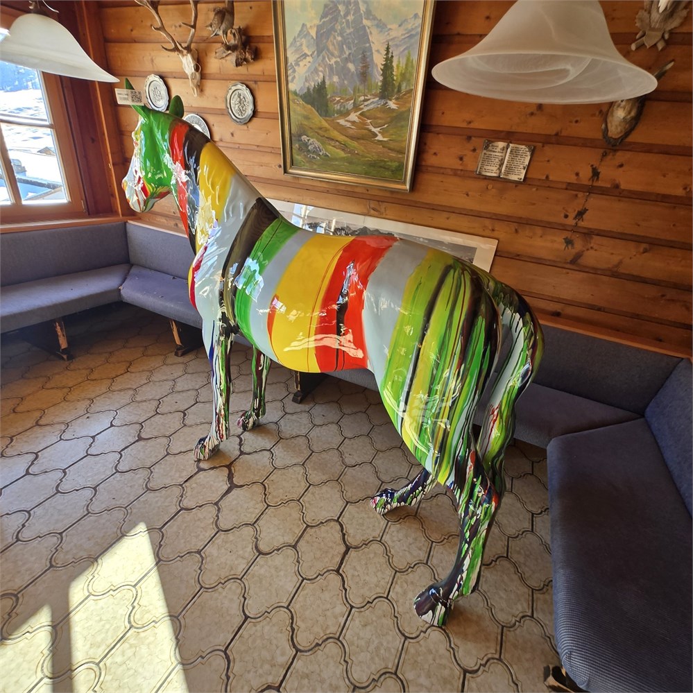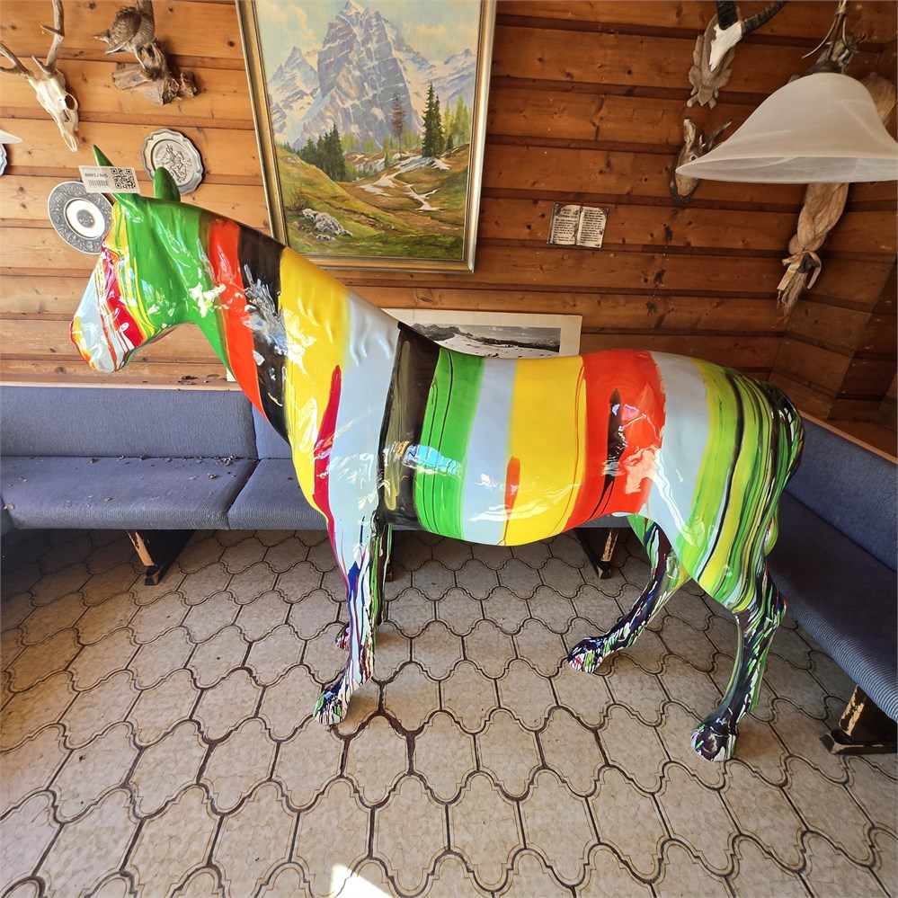 Lebensgroße Deko-Pferdefigur. Handbemalt, kräftige Farben in Rot, Gelb und Grün. Designerstück, Einzelanfertigung.
