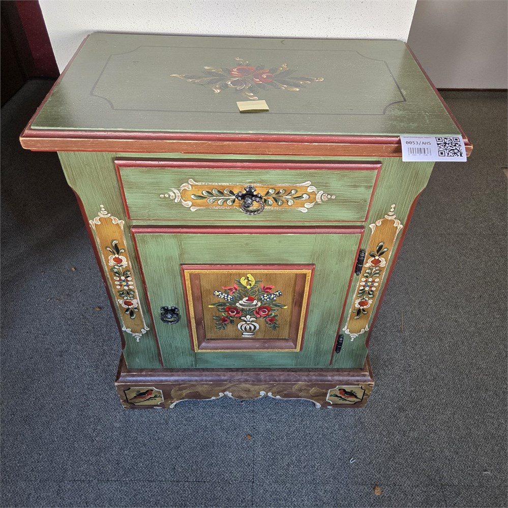 Kommode / Kasten Holz, 72 x 42 x 90 cm. Grün gefasste Bauernmöbel-Ausführung mit handbemaltem Blumen- und Rankendekor, Schublade oben, Tür unten.